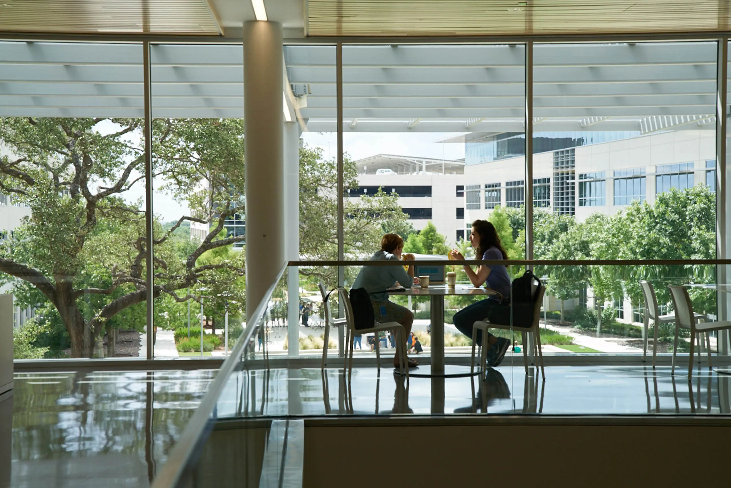 Another popular employee amenity area is found in the two-story café within Building 5. Considered the “central jewel” for the entire campus, the café serves a multitude of cuisines and acts as a common gathering area with generous indoor and outdoor seating.
